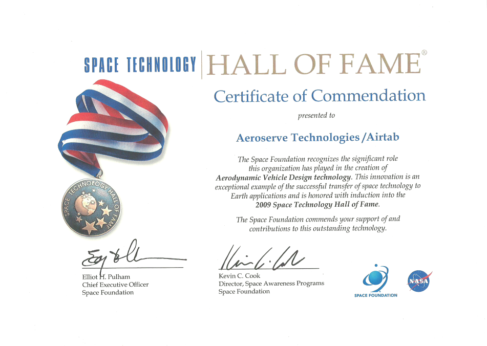 Airtabs en el salón de la fama de la industria aeroespacial de la NASA por su aportación a la industria del transporte terrestre.